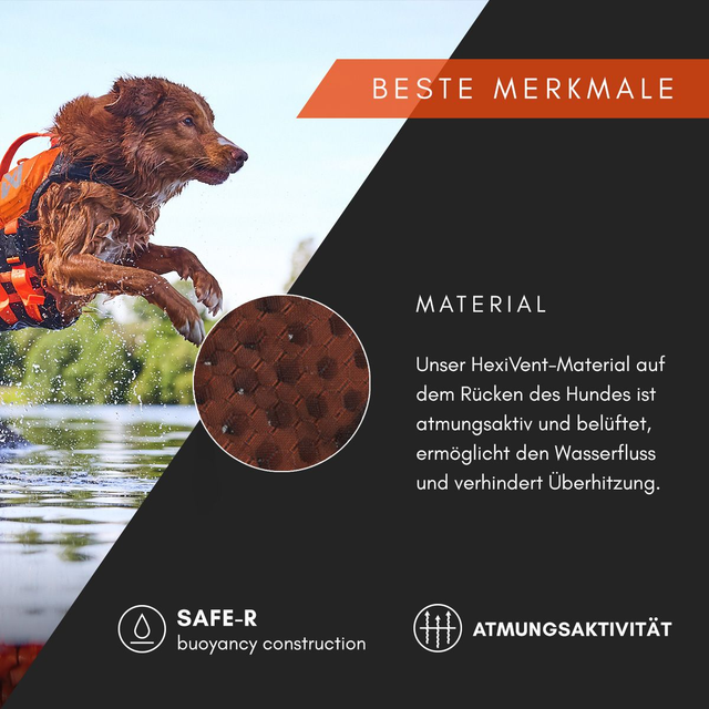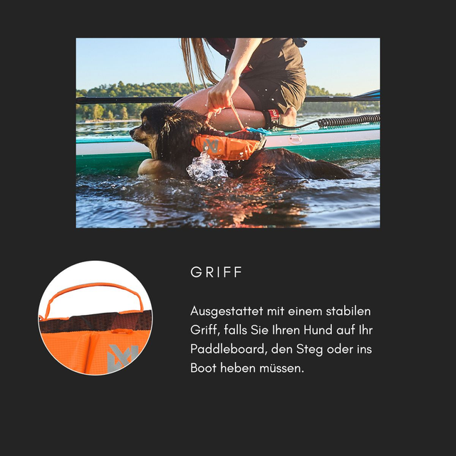 Das System wurde im offenen Wasser, in Schwimmbecken und auf Wasserlaufbändern mit verschiedenen Hunden gründlich getestet. Die Protector life jacket ist leuchtend orange mit reflektierenden Aufdrucken und Paspeln, so dass Dein Hund im Wasser leichter zu erkennen ist.